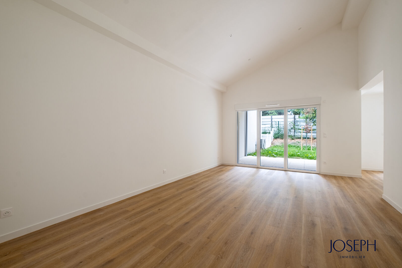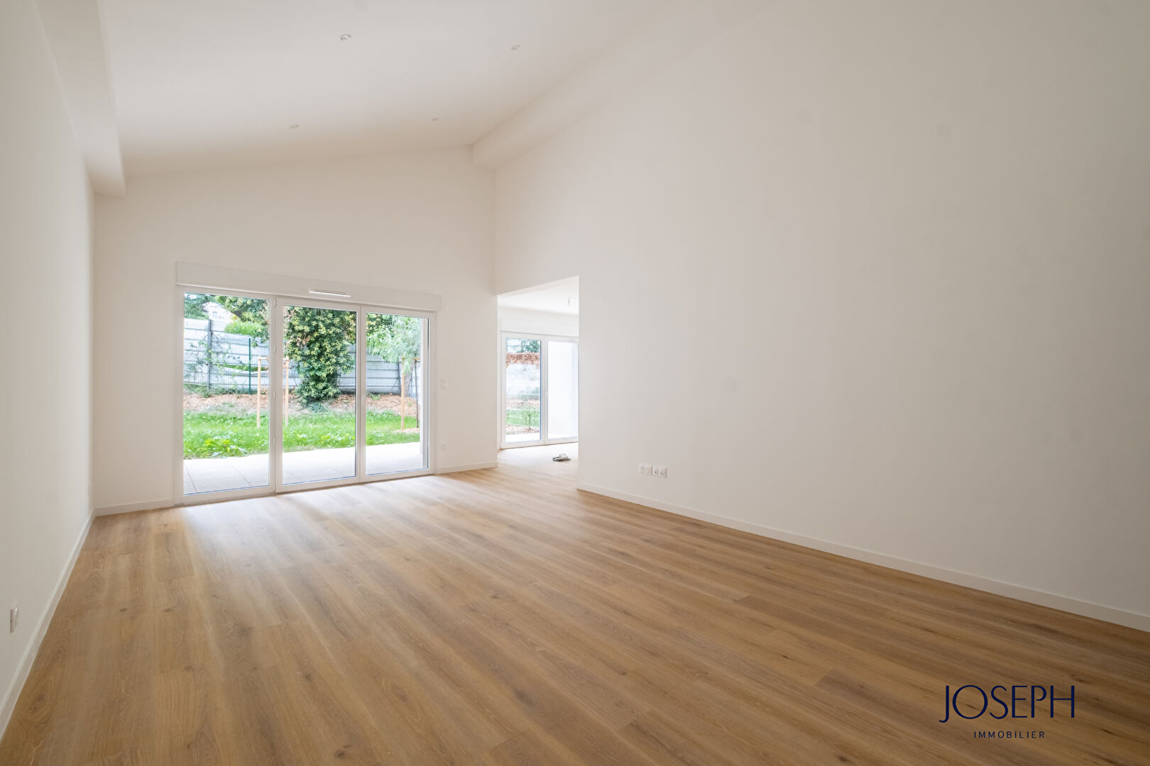 Le séjour de 26 m² avec cuisine ouverte de 10 m² s’ouvre sur une terrasse couverte et un jardin privatif de 90 m², sans vis-à-vis, donnant sur une zone boisée.